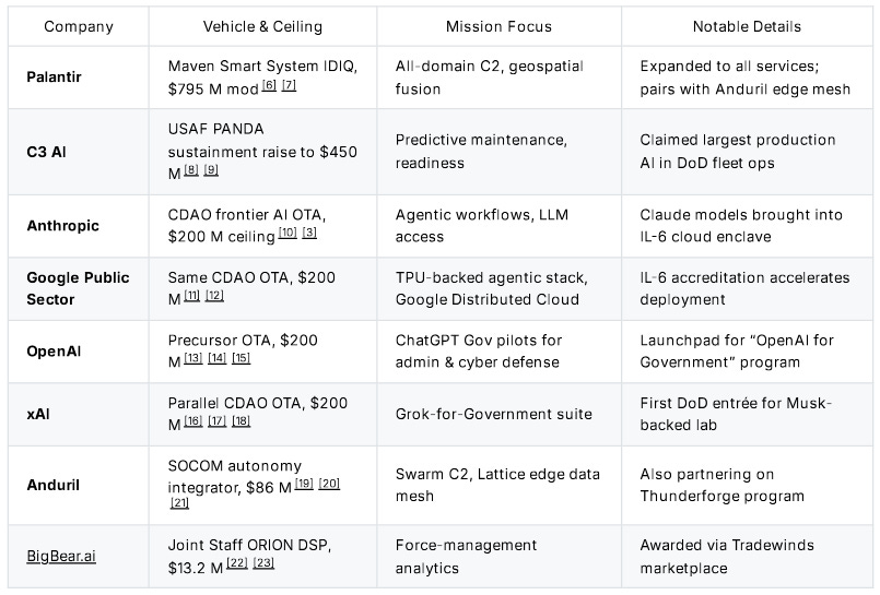 Commercial-first is real: For the first time, non-defense unicorns (Anthropic, OpenAI) hold vehicles on par with Lockheed’s software lines, shifting bargaining power toward software speed.