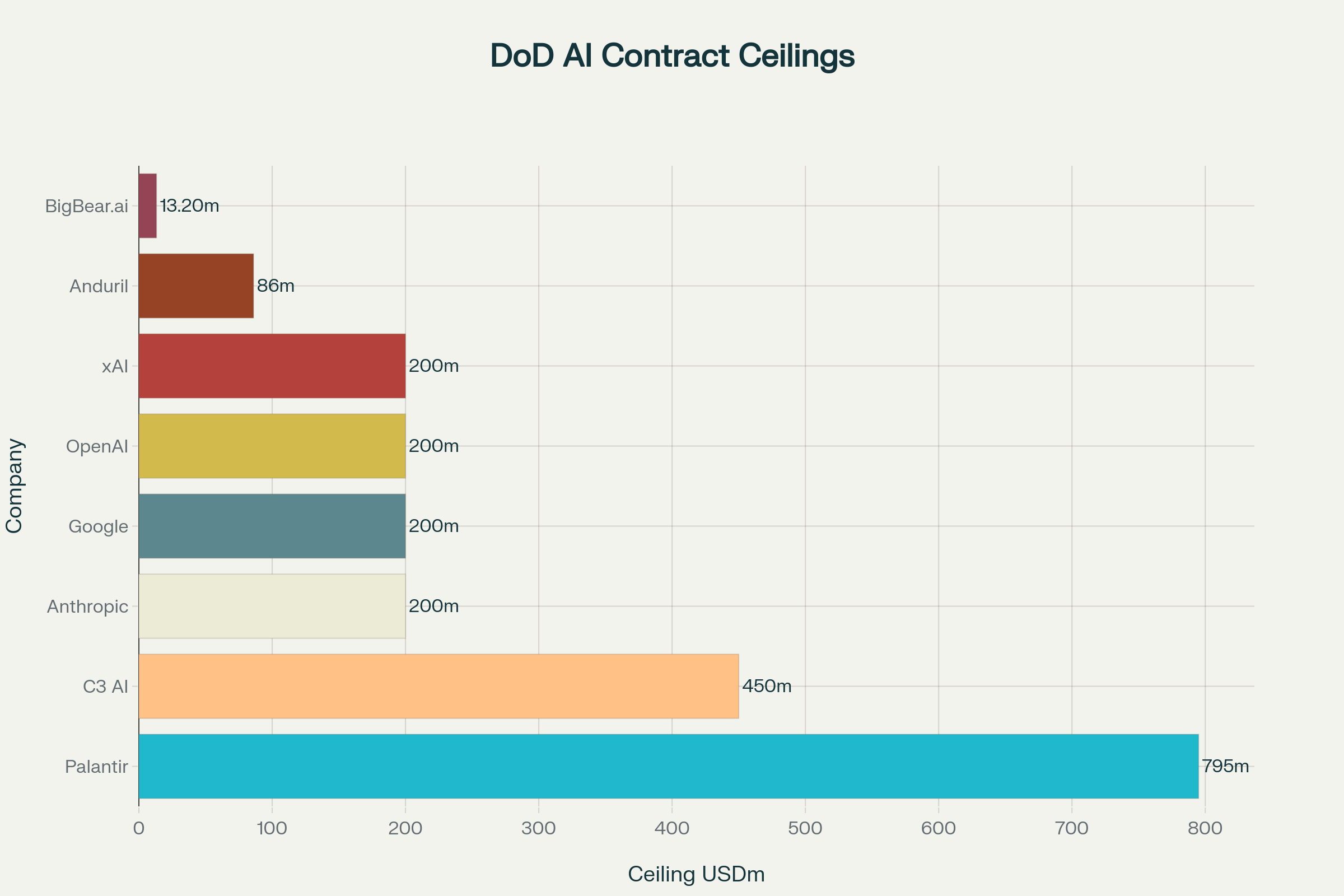 AI ≠ boutique SBIR: Contract ceilings now rival hypersonic missiles. Palantir’s $795 M and C3 AI’s $450 M prove AI has graduated to program-of-record scale.